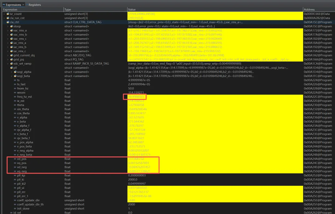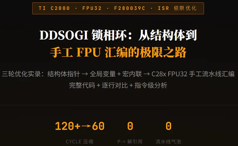 01为什么要折腾这个做三相整流器、Vienna PFC、并网逆变器,DDSOGI-PLL(Dual Second-Order Generalized Integrator PLL)几乎是标配锁相方案——相比 SRF-PLL 它能分离正负序,对电网不平衡和谐波都有更好的鲁棒性。但在 f280039c 这种 120MHz 单核 C28x 上,20kHz ISR 只给你 6000 个 cycle 的总预算。这 6000 cycle 里要塞下:PLL + Clarke + Park + 电流环 PI × 2 + SVPWM + 电压环 + 保护逻辑 + ADC 后处理……PLL 如果吃掉 120 cycle,就是总预算的 2%——听起来不多,但当你的电流环和 SVPWM 也各吃 80~100 cycle 时,每一个 cycle 都是在抢生存空间。这篇文章记录了我把 DDSOGI-PLL 中最密集的 Dual SOGI-QSG 模块从"人类友好的工程代码"一路优化到"CPU 友好的手工汇编"的完整过程。三个版本的完整代码都会贴出来,逐行解释每一步的收益和代价。02原版代码:结构体 + 指针 + 子函数先看完整的原版实现。这是非常标准的"工程师写法"——结构体封装所有状态,指针传递,子函数 cla_sogi_qsg_run() 封装 SOGI 计算,清晰、可调试、好维护:数据结构DDSOGI_PLL_t 结构体 — 原版Ctypedefstruct{ SOGI_QSG_t sogi_alpha; /* 内嵌子结构体, 又有 8 个 float */ SOGI_QSG_t sogi_beta; /* 第二路, 又 8 个 float */float32_t ts; /* 20kHz 采样周期 */float32_t ts_fast; /* 40kHz theta 更新周期 */float32_t fnom_hz;float32_t wnom;float32_t freq_hz_est;float32_t w_est;float32_t theta;float32_t sin_theta;float32_t cos_theta;float32_t v_alpha, v_beta;float32_t v_alpha_f, qv_alpha_f;float32_t v_beta_f, qv_beta_f;float32_t v_pos_alpha, v_pos_beta;float32_t v_neg_alpha, v_neg_beta; /* ← 负序, 很多场景用不到 */float32_t vd_pos, vq_pos;float32_t vd_neg, vq_neg; /* ← 负序 dq, 同上 */float32_t pll_kp, pll_ki, pll_ki2;float32_t pll_ui, pll_err, pll_err_1;uint16_t coeff_update_div;uint16_t coeff_update_div_th;uint16_t init_done;} DDSOGI_PLL_t;/* 总计: 2 × SOGI_QSG_t + 30+ 个 float + 3 个 uint16 * 结构体总大小轻松超过 64 word → 偏移超出 DP 页直接寻址范围 */20kHz 主函数cla_ddsogi_pll_run_20k() — 原版Cstaticinlinevoidcla_ddsogi_pll_run_20k(DDSOGI_PLL_t *p,float32_t va,float32_t vb,float32_t vc){/* Clarke */ p->v_alpha = PWR_CLARKE_ALPHA * (va - (0.5f * (vb + vc))); p->v_beta = PWR_CLARKE_BETA * (vb - vc);/* Dual SOGI-QSG — 两次子函数调用 */ cla_sogi_qsg_run(&p->sogi_alpha, p->v_alpha); // CALL #1 cla_sogi_qsg_run(&p->sogi_beta, p->v_beta); // CALL #2/* 读 SOGI 输出 → 写回结构体 (冗余搬运) */ p->v_alpha_f = p->sogi_alpha.d_out; // p-> 读 → p-> 写 p->qv_alpha_f = p->sogi_alpha.q_out; p->v_beta_f = p->sogi_beta.d_out; p->qv_beta_f = p->sogi_beta.q_out;/* 正序 / 负序分解 — 全部写回结构体 */ p->v_pos_alpha = 0.5f * (p->v_alpha_f - p->qv_beta_f); p->v_pos_beta = 0.5f * (p->qv_alpha_f + p->v_beta_f); p->v_neg_alpha = 0.5f * (p->v_alpha_f + p->qv_beta_f); // ← 很多场景不需要 p->v_neg_beta = 0.5f * (p->v_beta_f - p->qv_alpha_f); // ← 同上/* Park 变换 (正序 + 负序) */ p->vd_pos = (p->cos_theta * p->v_pos_alpha) + (p->sin_theta * p->v_pos_beta); p->vq_pos = -(p->sin_theta * p->v_pos_alpha) + (p->cos_theta * p->v_pos_beta); p->vd_neg = (p->cos_theta * p->v_neg_alpha) - (p->sin_theta * p->v_neg_beta); p->vq_neg = (p->sin_theta * p->v_neg_alpha) + (p->cos_theta * p->v_neg_beta);/* PLL PI */ p->pll_err = p->vq_pos; ui_step = p->pll_ki2 * (p->pll_err + p->pll_err_1); i_new = p->pll_ui + ui_step; w_raw = p->wnom + (p->pll_kp * p->pll_err) + i_new; p->w_est = cla_pll_clamp_f32(w_raw, CLA_PLL_W_MIN, CLA_PLL_W_MAX);/* 条件反饱和 */if(!((w_raw > CLA_PLL_W_MAX && p->pll_err > 0.0f) || (w_raw < CLA_PLL_W_MIN && p->pll_err < 0.0f))) { p->pll_ui = i_new; } p->pll_err_1 = p->pll_err; p->freq_hz_est = p->w_est * PWR_CONST_INV_TWO_PI;/* SOGI 系数自适应更新 (每 ~10ms) */ p->coeff_update_div++;if(p->coeff_update_div >= p->coeff_update_div_th) { ... }}数一下 p-> 的次数整个函数中 p->xxx 出现了 50+ 次。每一次在 C28x 上都编译为间接寻址 *+XAR4[offset]。当结构体偏移超过 63 word(这个结构体轻松超过),编译器还要插入额外的 ADD 指令来计算偏移。此外:两次 cla_sogi_qsg_run() 子函数调用各有 ~4 cycle 的 CALL/RET 开销;负序 dq 计算和回写在很多场景下完全不需要;SOGI 输出先写到子结构体再读出来写到父结构体——纯粹的数据搬运浪费。03四层性能开销拆解⛔ 开销来源① p-> 间接寻址 × 50+:每次 +1 cycle② 结构体 > 64 word:偏移需额外 ADD③ 子函数 CALL/RET × 2:~8 cycle④ 负序 dq + 冗余赋值:~15 cycle✅ 理想状态① DP 直接寻址 @_var:1 cycle② 同一 DP 页:零偏移计算③ 内联展开:零调用开销④ 只算/只写外部需要的总的来说,原版的性能开销主要不是"算法本身慢",而是数据搬运和寻址模式的开销远超计算本身。SOGI 的核心只是 4 次 FMAC + 2 次 FADD,但被结构体指针、函数调用、冗余赋值包裹了厚厚一层外壳。04第一轮优化:全局 static + 宏内联核心洞察:三相系统只需要一套 PLL。不需要多实例,也就不需要结构体和指针。变量定义:拆结构体为全局变量原版 — 结构体内嵌/* 全部塞在一个巨型结构体里 */DDSOGI_PLL_t g_pll;/* 访问方式: */p->sogi_alpha.d_outp->v_alpha_fp->vd_posp->pll_ui/* ... 每次 *+XAR4[n] 间接寻址 */优化版 — 全局 static/* SOGI 系数 (两路共用!) */staticfloat32_t gs_sogi_b0;staticfloat32_t gs_sogi_a1;staticfloat32_t gs_sogi_a2;staticfloat32_t gs_sogi_qb0;/* Alpha 路状态 */staticfloat32_t gs_sa_x1, gs_sa_x2;staticfloat32_t gs_sa_yd1, gs_sa_yd2;staticfloat32_t gs_sa_yq1, gs_sa_yq2;/* Beta 路状态 (同结构) */staticfloat32_t gs_sb_x1, gs_sb_x2;/* ... *//* PLL 核心 */staticfloat32_t gs_pll_sin, gs_pll_cos;staticfloat32_t gs_pll_w_est;staticfloat32_t gs_pll_vd_pos;/* 访问方式: @_gs_xxx 直接寻址 */SOGI 宏