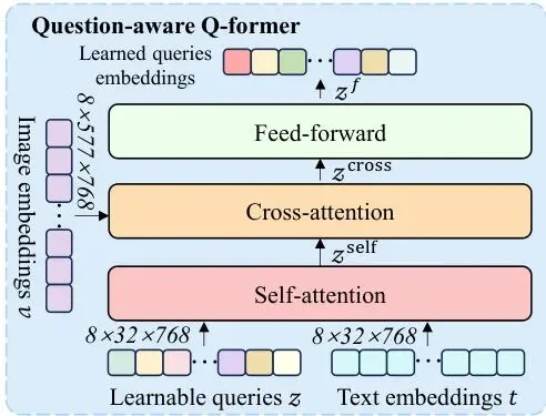 图2:QQ-Former(问题感知的Q-Former)的详细结构,包含自注意力和交叉注意力层,用于对齐视觉和文本特征。