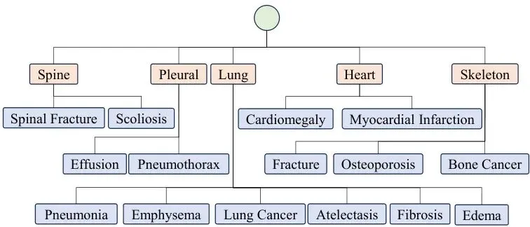 图3:一个预构建的知识图谱示例。绿色圆圈代表全局节点,橙色框代表器官级实体,蓝色框代表关键发现(如病变)。它们之间通过边连接。