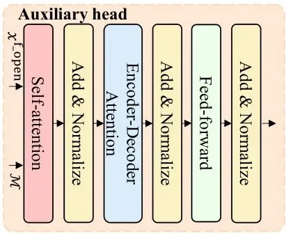 图5:辅助头(AHead)的详细结构。它基于T5解码器,用于在训练时生成自由形式的答案,通过一个可学习的注意力掩码聚焦于多模态特征中的重要部分。