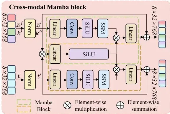 图4:交叉模态Mamba(CMM)块的详细结构。它通过Mamba的选择性扫描机制,高效地融合视觉、文本和知识特征。