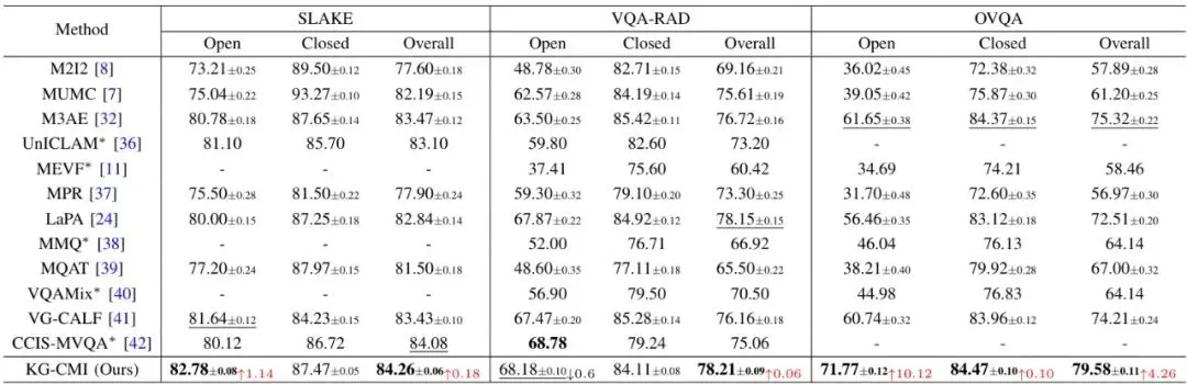 表1:在SLAKE、VQA-RAD和OVQA数据集上与最先进方法的性能比较(准确率,%)。不带星号的结果报告为平均值±标准差。最佳值用粗体标出,相对于第二好结果的改进用红色标出。