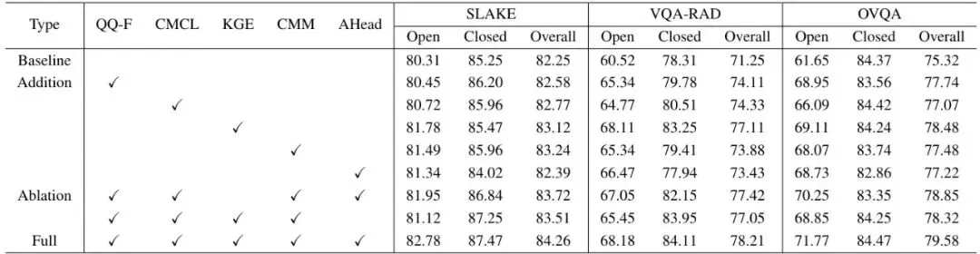 设计得好,更要效果硬。论文在三个主流Med-VQA数据集上进行了全面测试:SLAKE(涵盖多器官)、VQA-RAD(放射学)、OVQA(骨科学)。