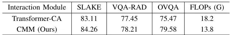 表7:CMM与交叉注意力(CA)的实证比较,显示CMM在性能和效率上的优势。