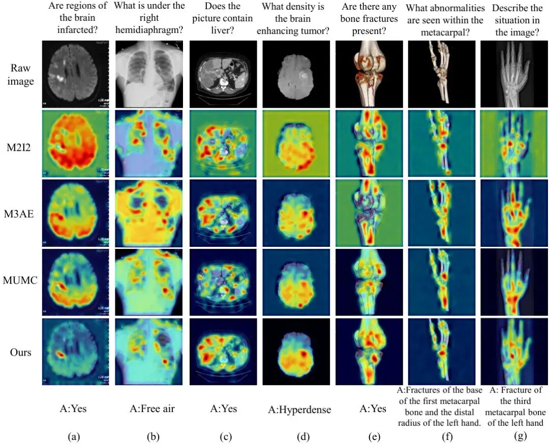 看图7的例子,对于问题“Is there air in the pericardium?”(心包里有空气吗?),基线模型M3AE的注意力散乱,而KG-CMI的注意力(红色高亮区)清晰地集中在了心包区域的异常亮斑(空气)上。这强烈表明,KG-CMI不仅答对了,而且是真的“看懂”了图像,并基于正确的区域做出了推理。