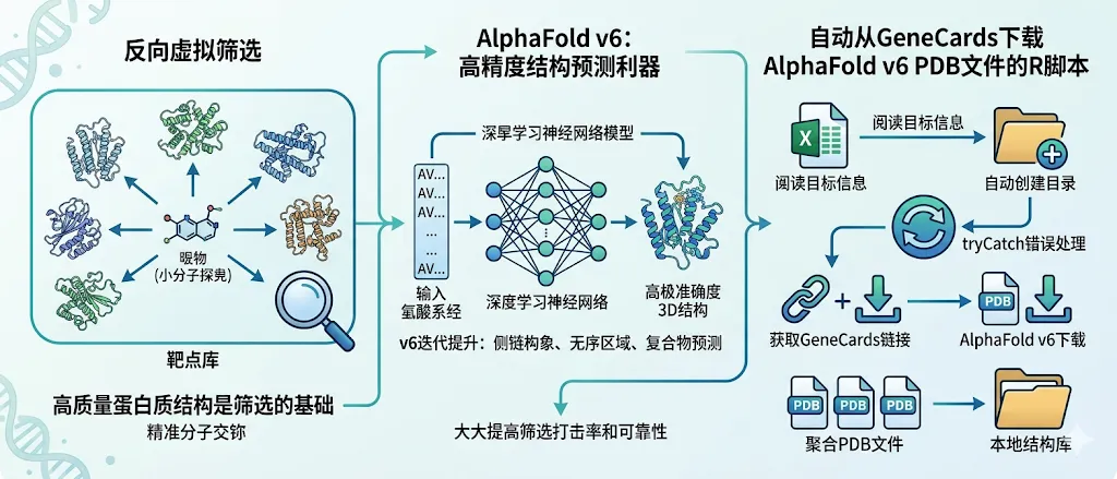本期推文聚焦反向虚拟筛选中的关键基础——蛋白质结构库的构建。我们详细介绍了为什么高质量的三维结构对药物发现至关重要,并以AlphaFold v6版本为例,提供了一个完整的R脚本,用于从GeneCards链接批量下载蛋白质PDB文件,助力科研人员快速搭建本地结构库。