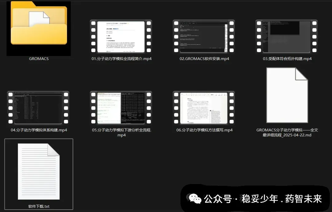 课程总时长4小时左右,从动力学模拟原理解读、GROMACS软件安装、受配体拆分预处理、拓扑文件构建、模拟体系搭建、动力学模拟以及下游分析、结果图的绘制和解读、文章发表的撰写方法;可以说是全流程一课通!!!