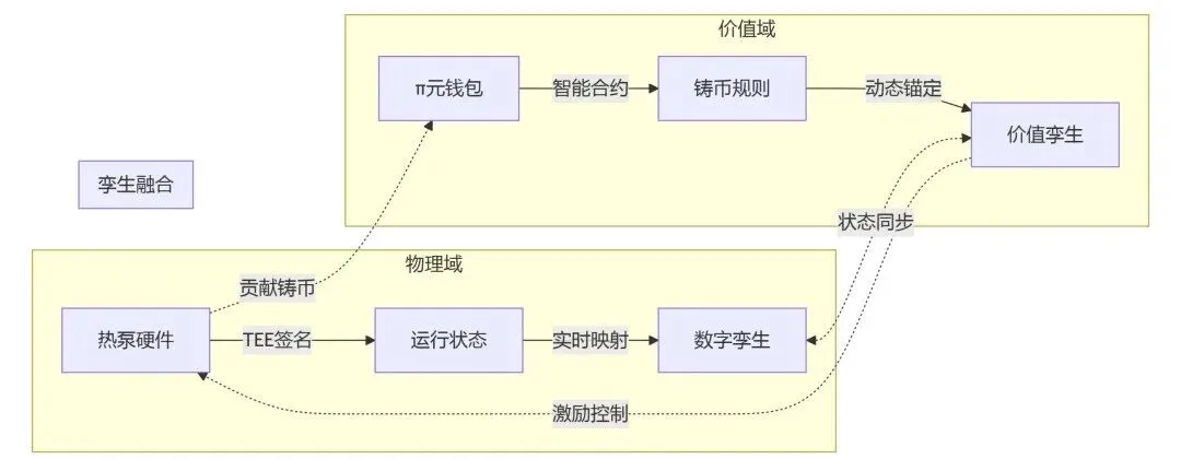 - 两者通过链上存证形成不可篡改的因果链条:热泵运行数据→物理AI验证→减排量上链→π元铸造。