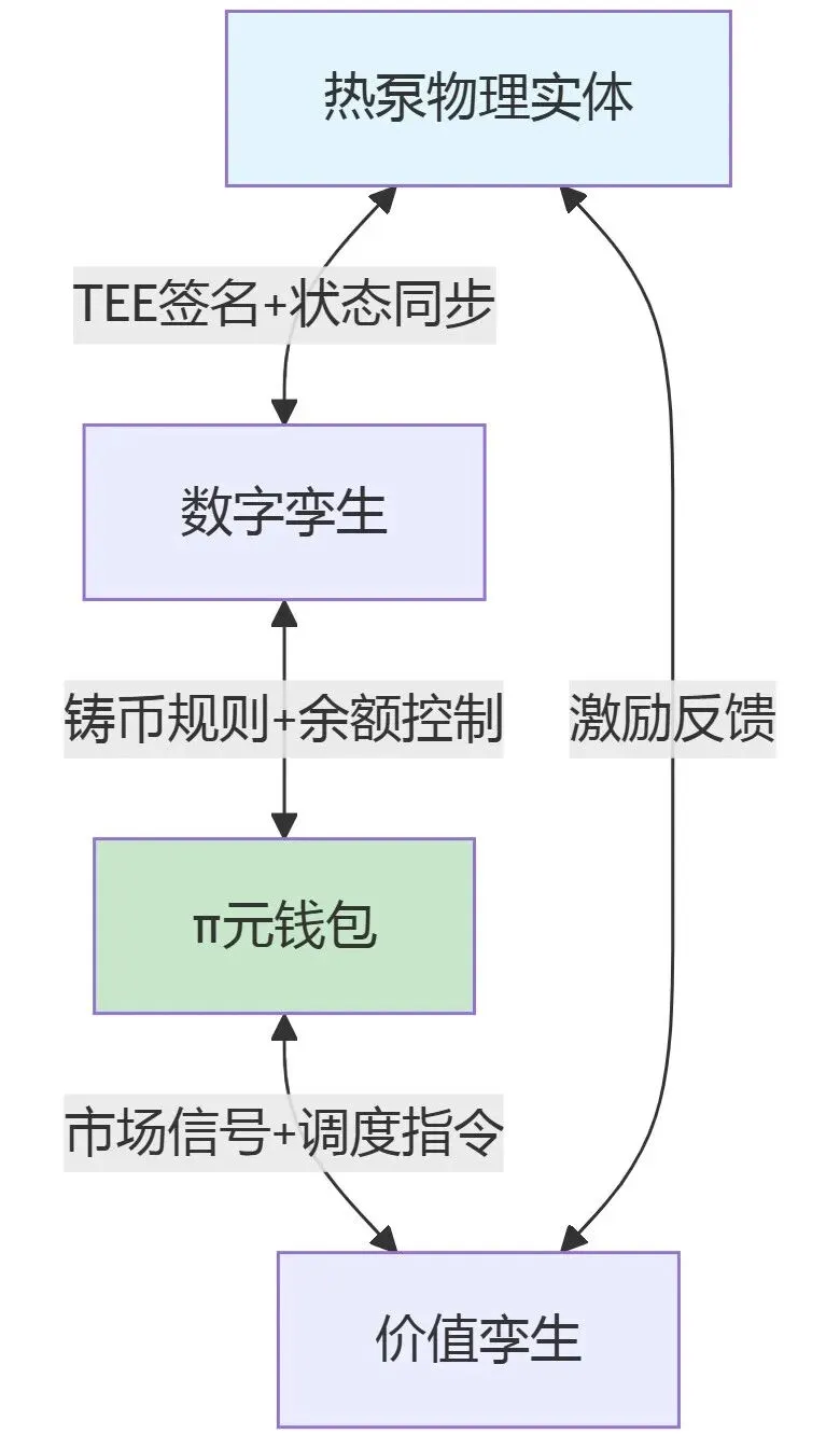 原子绑定:每台热泵出厂时,其硬件ID与一个π元钱包地址绑定,该钱包的私钥部分存储在TEE中。热泵运行即自动签名交易,无需人工干预。