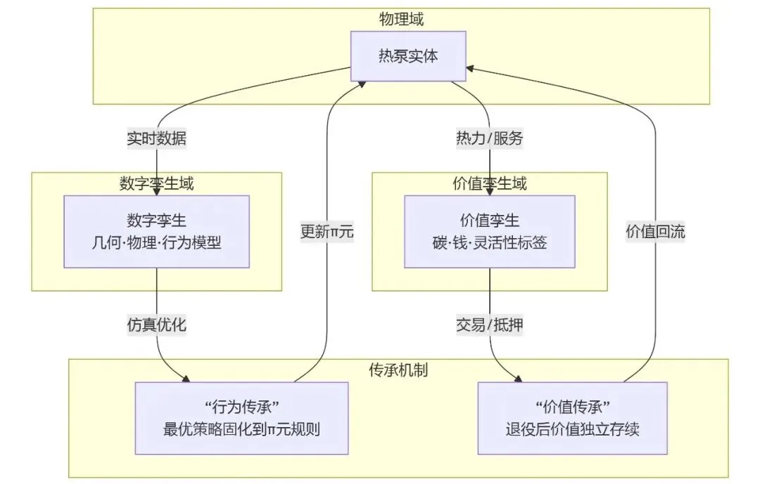 - 传承体现在:一个热泵在退役后,其价值孪生体仍可继续参与市场(例如做为虚拟储能),将历史运行数据转化为持续收益。