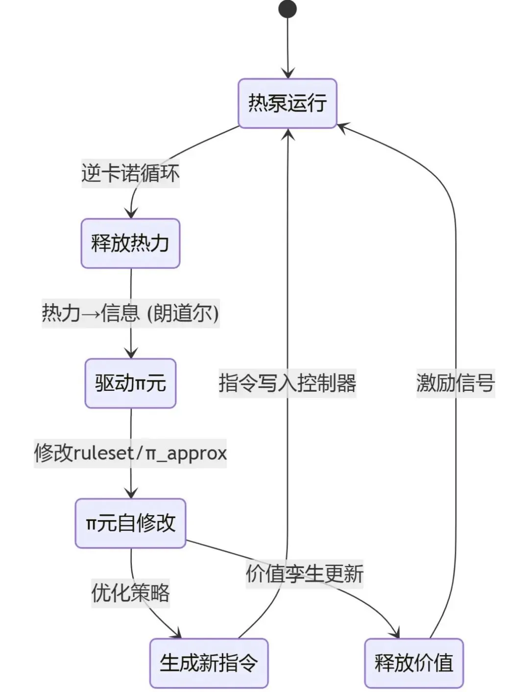 热泵消耗电力或热驱动产生热力输出,同时其运行数据被π元捕获;π元经过自修改后,生成新的控制指令回写给热泵。这个循环中,热力与信息不可分割--热泵的每一度温升都伴随π元的一次自指运算。