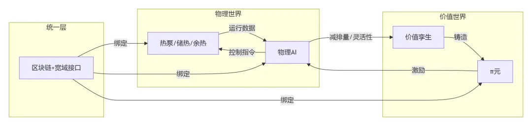 数字孪生是指物理设备(热泵、储热罐、余热源)在数字空间中的实时镜像。物理AI正是这一镜像的智能体--它感知设备状态、预测未来行为、并执行控制指令。而π元,则是这个数字孪生所承载的价值尺度。