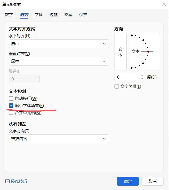 在弹出的窗口中,切换到「对齐」选项卡,找到下方「文本控制」区域,勾选「缩小字体填充」,这一步是实现字体自动适配的关键!这里要注意的是自动换行和缩小字体填充不能同时选择,如果勾选了自动换行,缩小字体填充那里就会是灰色的,无法勾选。