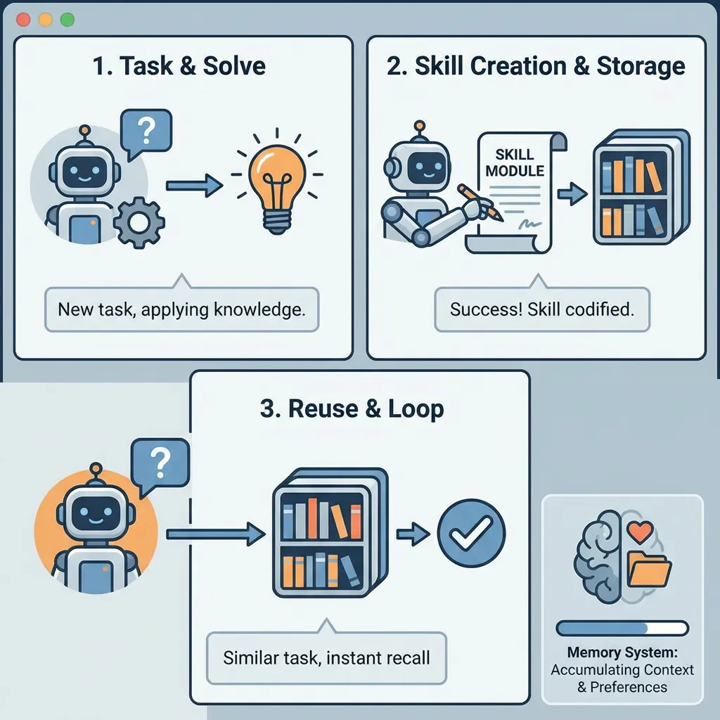 用一张图来说的话,大概是这个流程,你给它一个任务→它用现有知识解决→解决成功后自动写成技能→技能入库→下次遇到类似问题直接调用→循环往复。同时记忆系统一直在旁边默默积累你的偏好和项目上下文。
