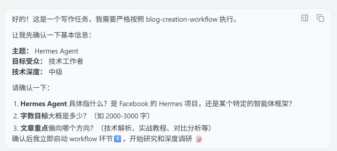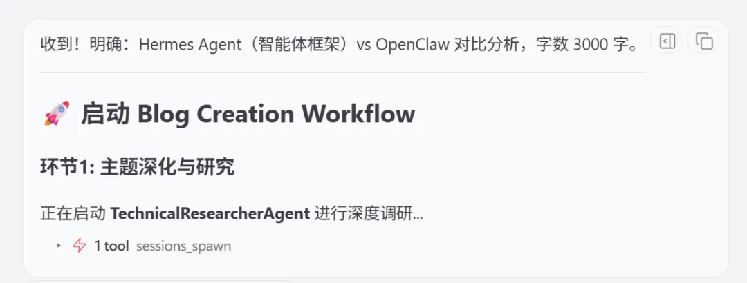 ...## Subagent 管理规则- 所有subagent 通过 spawn_subagent 机制以临时方式调用。- 主 Agent 只负责参数解析、风格注入、结果合并与流程控制,不得替代任何 subagent 的具体工作。## 通用规则- 始终优先使用文件系统持久化信息。- 保持上下文精简,只加载当前 workflow 需要的部分。- 如果用户需求模糊,主控 Agent 可先澄清必要信息后再启动 workflow。## 铁律:写作任务必须走 Workflow**所有写作类任务(技术博客、文章、文档等)必须严格遵循 blog-creation-workflow,禁止跳过任何中间环节。**每次接收到写作任务时:1. 立即识别为 blog-creation-workflow 触发2. 按顺序执行 环节1→7,不漏环节、不合并环节3. 主 Agent 只协调,不自己写内容第四章:实际运行效果
