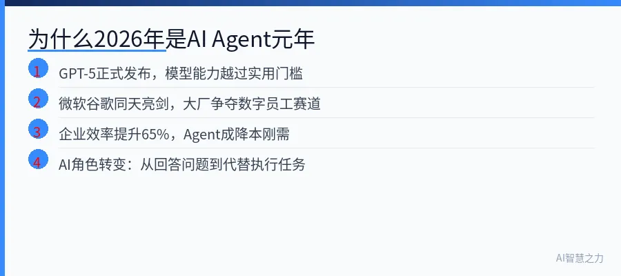 2026年被广泛视为"AI Agent元年"。这个说法的核心不是某个新模型的发布,而是一个根本性的转变:AI正在从"能对话"进化到"能自主完成任务"。