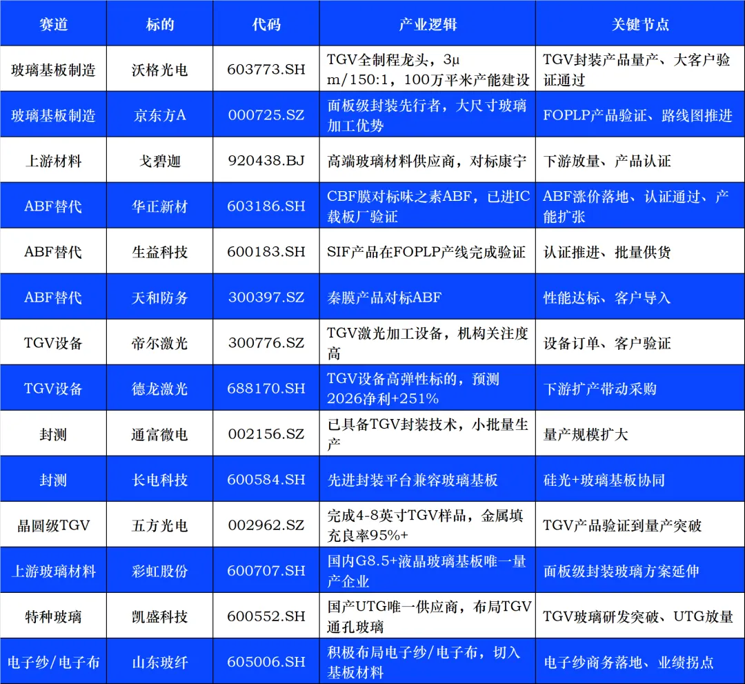 投资主线的边际变化在于三重催化共振: 一是英特尔2026年1月首秀EMIB玻璃基板,量产路线图持续推进;二是ABF材料供应链脆弱性暴露(味之素垄断95%份额,Palliser Capital要求涨价30%+),国产替代窗口打开;三是国内龙头沃格光电TGV全制程技术成熟,100万平米产能建设推进。