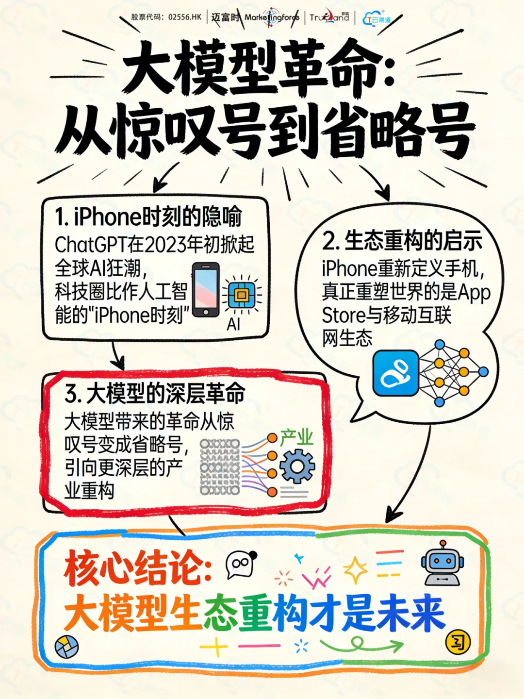 当ChatGPT在2023年初掀起全球AI狂潮时,科技圈将其比作人工智能的“iPhone时刻”。两年过去,这个比喻的深意才逐渐显现——正如iPhone重新定义了手机,但真正重塑世界的,是紧随其后的App Store与移动互联网生态,大模型带来的革命也正在从惊叹号变成省略号,引向更深层的产业重构。