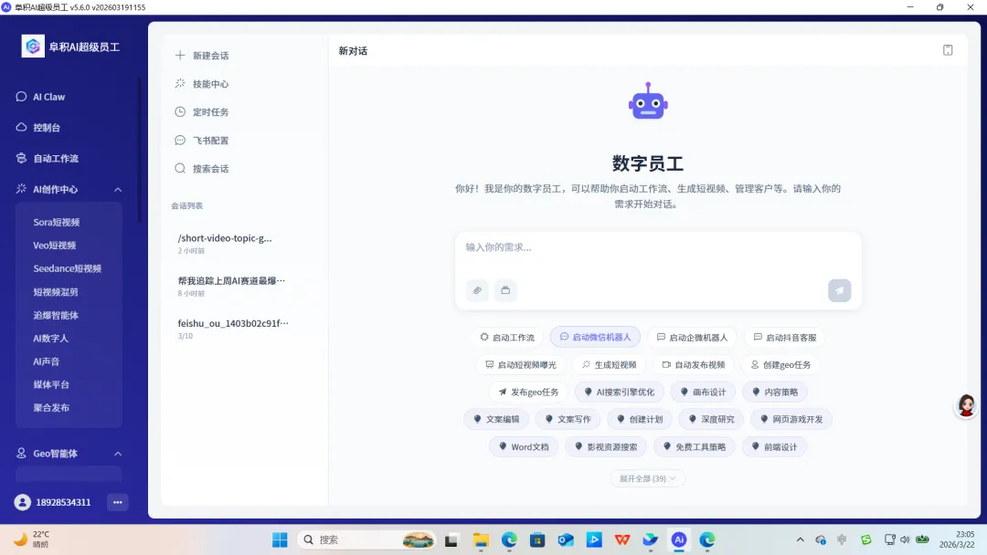 微信 ClawBot 全面接入阜积 AI 超级员工,随时随地通过微信一句话发送指令,电脑端即可全自动完成全链路营销工作:启动抖音客服,自动处理平台私信并将意向客户导流至私域;用户仅需阐述内容需求,AI便能迅速完成创作。随后,它会自动将作品发布至抖音、快手、视频号、小红书、B站等多个热门平台,高效又便捷。