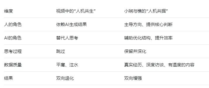 视频里的“人机共生”,是人把思考外包给AI,AI被垃圾数据毒害。而我们的“人机共掘”,是人主导思考,AI辅助呈现。