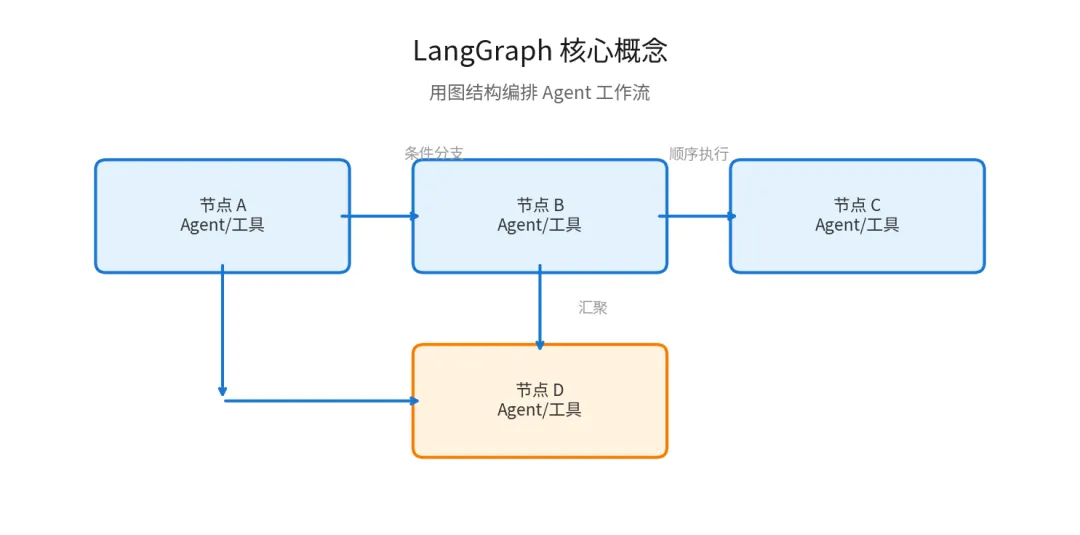 每个节点是一个 Agent 或工具,边定义执行顺序和条件。