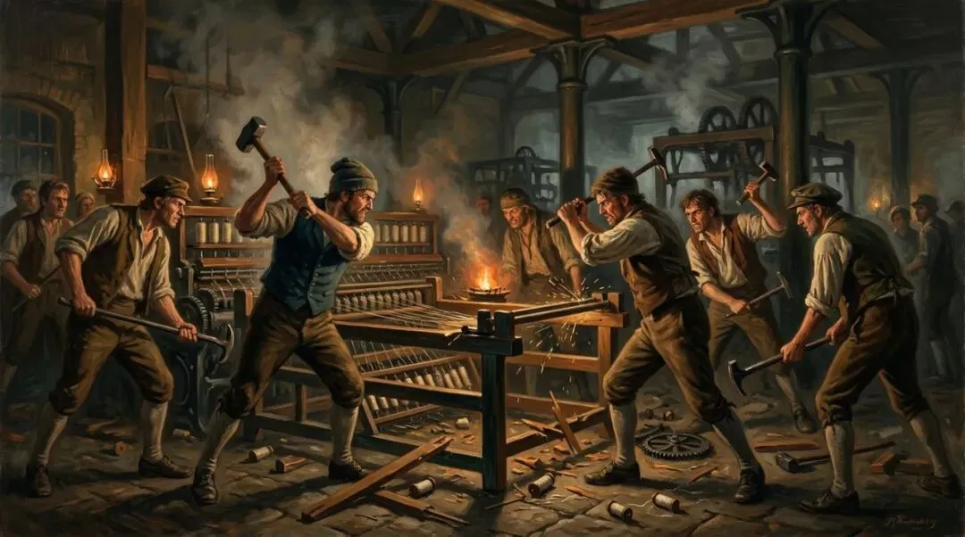 工厂主引进机器,第一步是削减工资。工人们去游说政府,政府不管。他们尝试了请愿、示威、合法抗议,全部失败。最后只剩下铁锤。