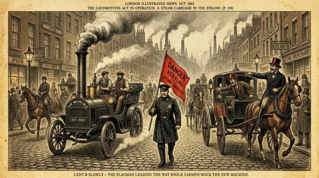 1865年,英国立法:汽车前必须有人挥红旗引路,时速不得超过马车。