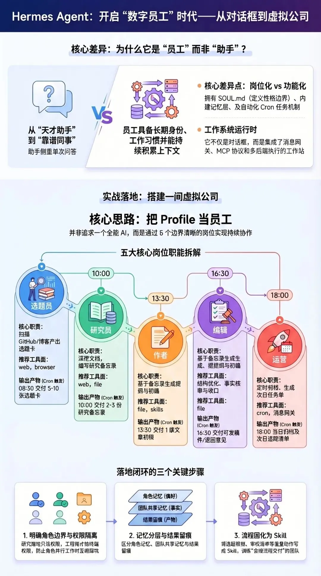 所以,如果真想把 Hermes 用到内容生产里,我反而不建议从“一个最强 agent”开始,而建议从“几个边界清楚的岗位”开始。