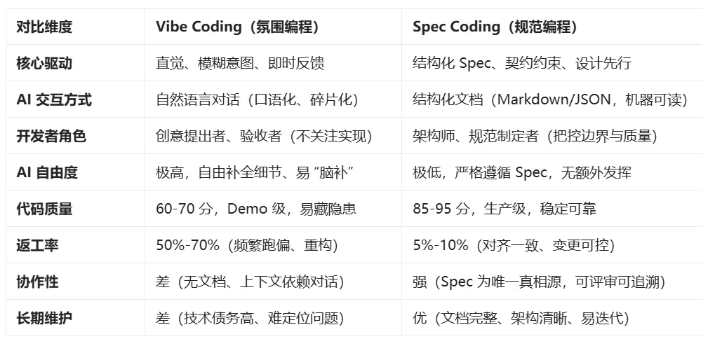 从对比中不难发现:Vibe Coding 赢在“快”,却输在“稳”;Spec Coding 赢在“稳”,却输在“快”。