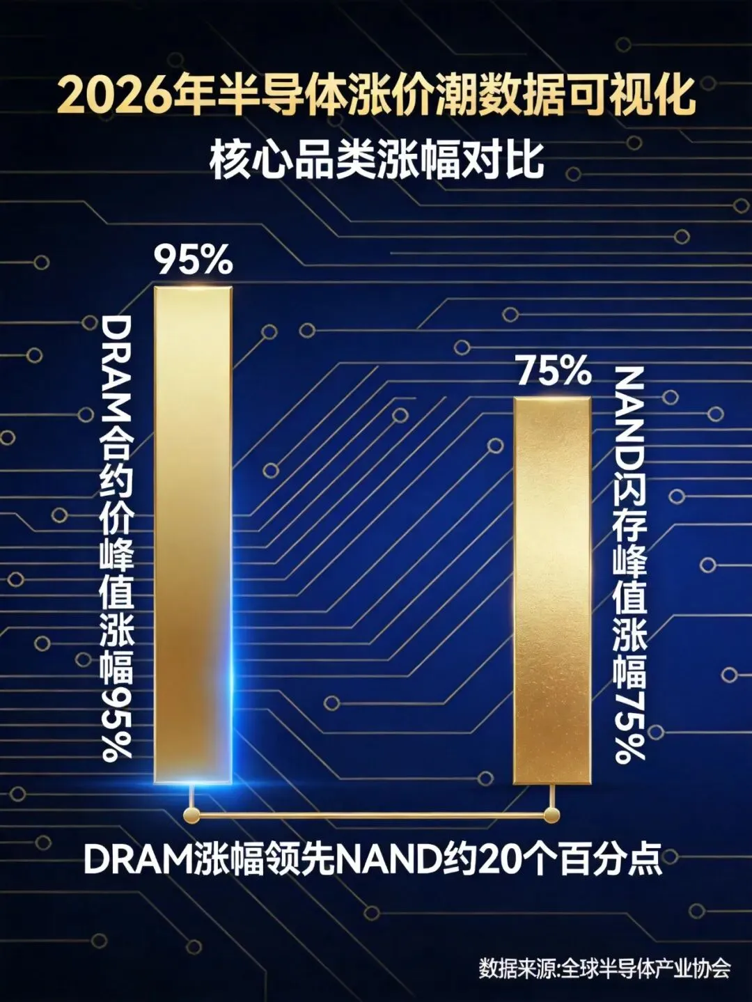 2026年一季度,一份来自集邦咨询的数据震动了整个半导体圈:DRAM合约价涨幅从年初预估的55%-60%,一路上调至90%-95%;NAND Flash合约价从33%-38%上调至55%-60%。这不是偶发的价格波动,而是AI算力需求爆发、供应链重构与地缘博弈三重因素共振的结构性行情。