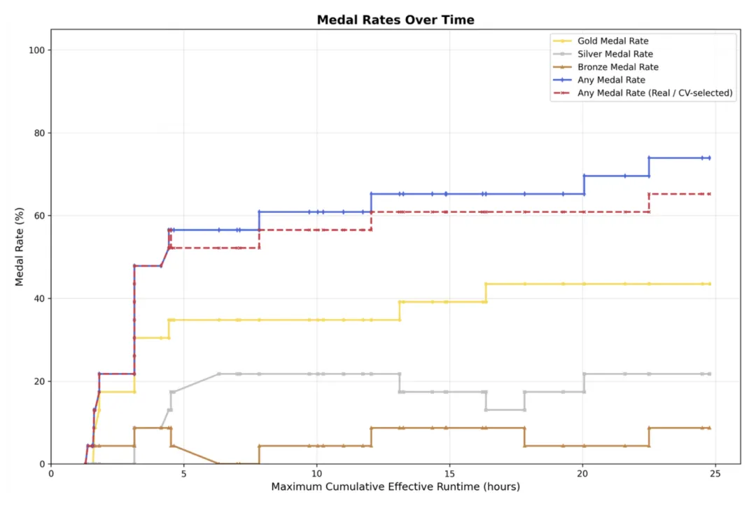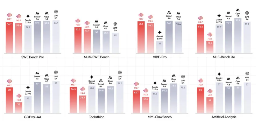 在 OpenAI 开源的 MLE Bench Lite(22 项 ML 竞赛,单卡 A30,每次 24 小时)评测中,M2.7 最佳运行获得 9 金、5 银、1 铜,三次运行平均奖牌率 66.6%,全球排名第三,仅次于 Opus 4.6(75.7%)和 GPT-5.4(71.2%),与 Gemini-3.1 持平。