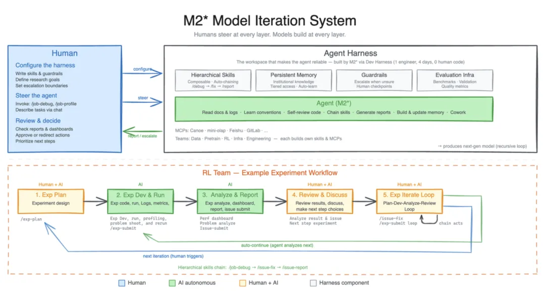 MiniMax 构建了一套内部研究 Agent 框架,支持数据 Pipeline、训练环境、基础设施、跨团队协作与持久化记忆。在强化学习团队的日常工作流中,Agent 负责文献综述、实验追踪、日志读取、调试、指标分析、代码修复与合并请求。M2.7 目前能够处理该工作流中 30%~50% 的任务。