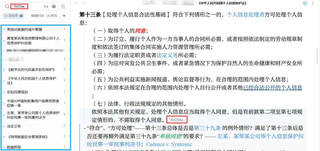 同理,搜索一条法条的标注号,也可以显示该法条被哪些案例、法律概念或其他笔记引用: