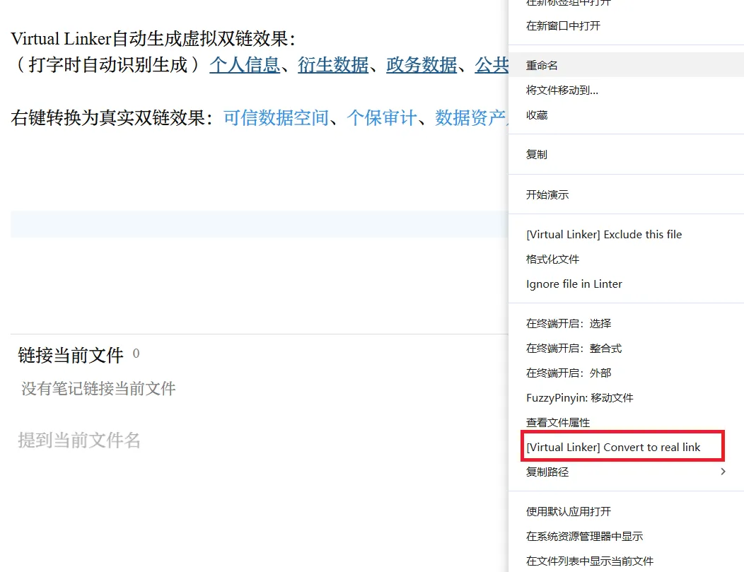 如果你觉得手动创建双链太麻烦,Virtual Linker 插件可以自动检测笔记中的关键词、并且将其自动以特殊格式显示为潜在链接(下文深蓝下划线格式),右键即可将其转换为真实链接: