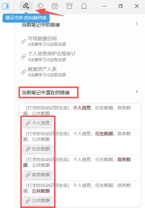 结合前面的双向链接和关系图谱功能,你可以把这些法规和案例链接到你自己的笔记,意味着你可以一键查看一个案例、一条法条在哪些课程里被引用、在哪些工作项目里被提及。你也可以引用这些法规和案例构建你自己的名词解释库。