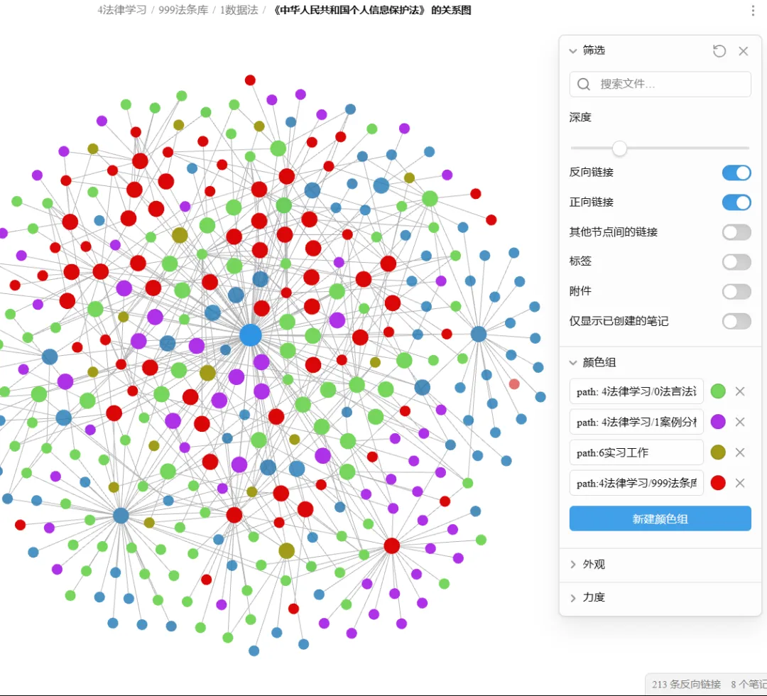 当然你也可以单独点开《个保法》、只查看与《个保法》有关的笔记(在《个保法》笔记页面按下 Ctrl+Shift+G)。这个时候就能看到《个保法》的二级甚至三级引用了(通过调整右侧“深度”选项实现):