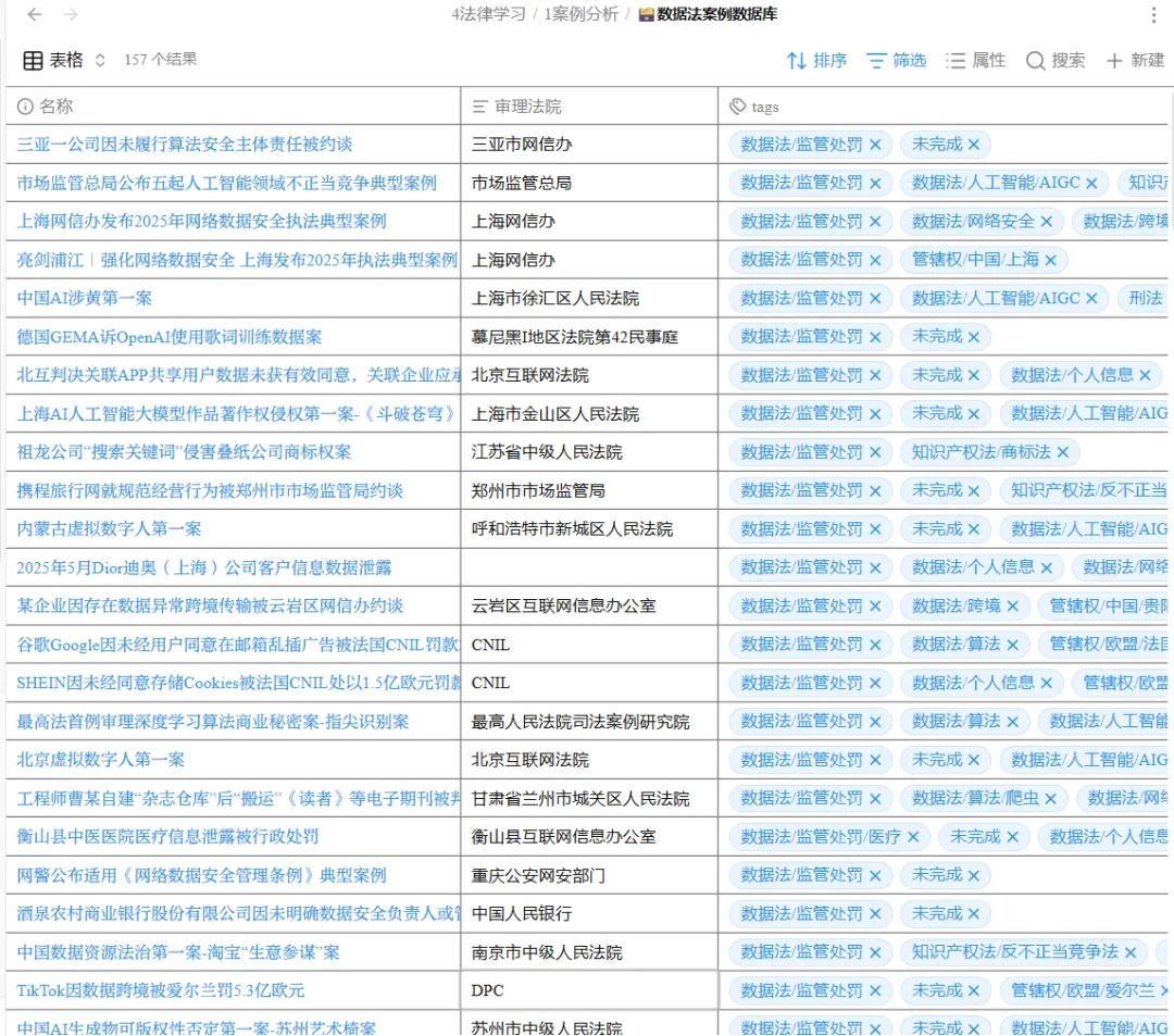 Obsidian 自带Base功能,加上社区的Dataview插件,可以结合双向链接生成属于你自己的案例和法规库面板,根据分类、标签和关键词,汇聚不同笔记库中不同文件夹下的笔记,并可显示案例概要,方便查看。