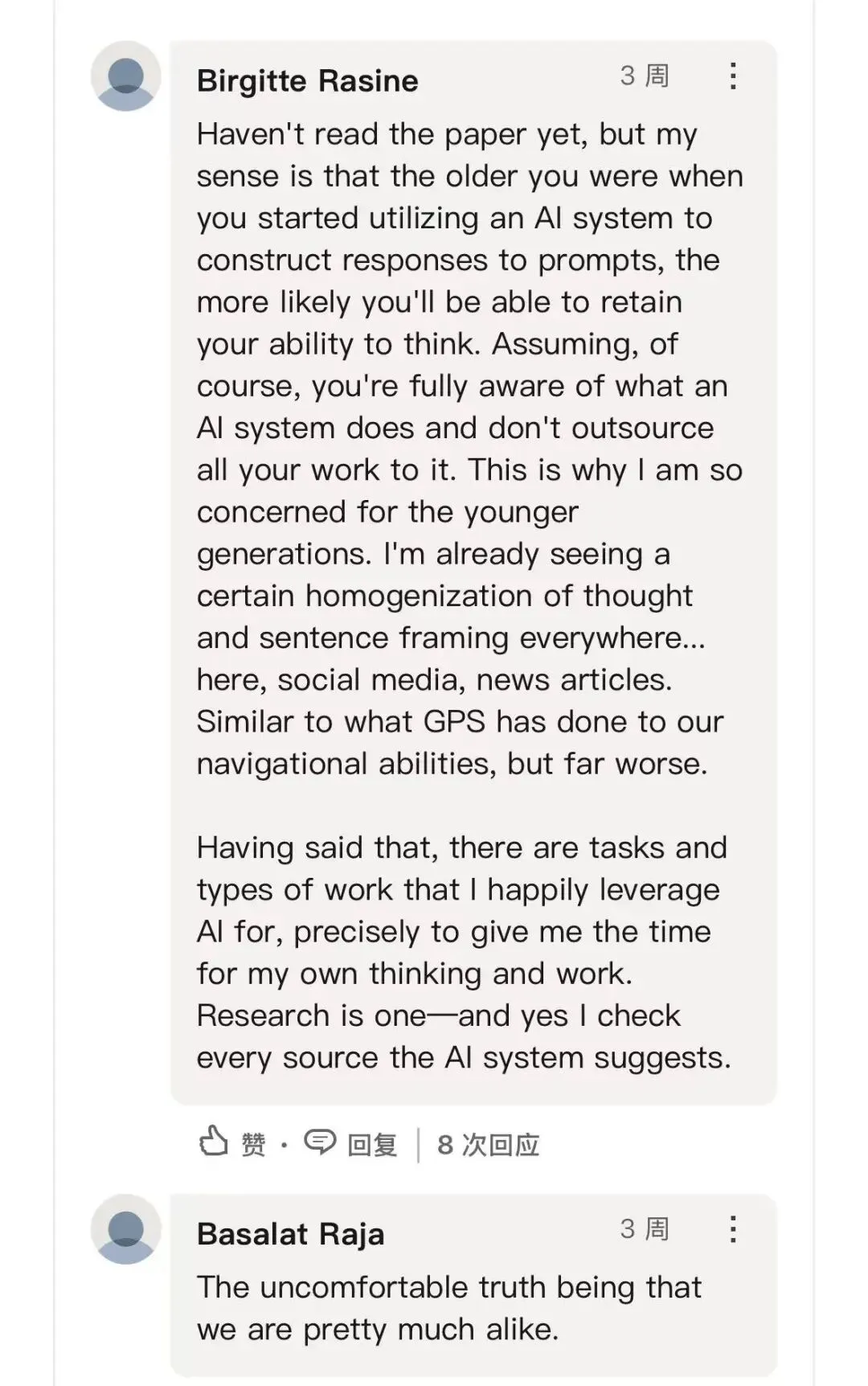 有些网友认为:你开始使用AI时的年龄越大,你越有可能保留自己的思考能力——前提是你清楚地知道AI在做什么,并且没有把所有工作都外包给它。