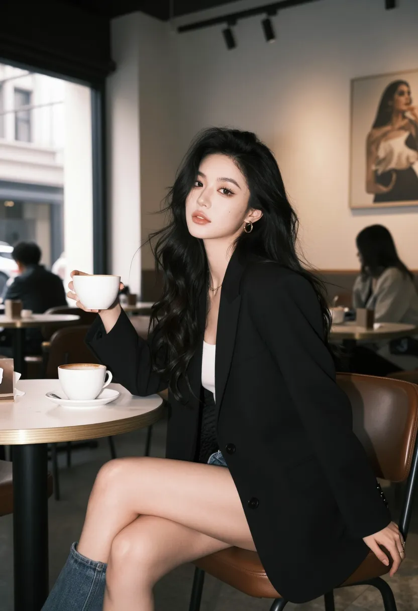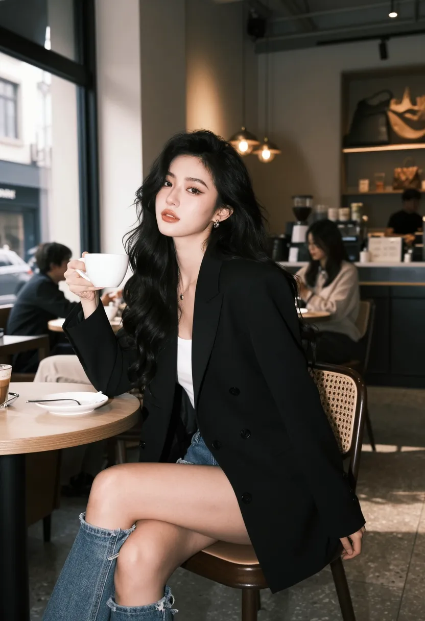 8K, ultra-detailed, masterpiece, best quality, lifestyle photography, Western cafe art style, Asian female in Western-style cafe, wearing elegant black blazer over white top and jeans, long black wavy hair flowing naturally, graceful and seductive pose, sitting at cafe table with one hand holding coffee cup, other hand resting on table, natural expression with confident smile, modern Western cafe setting with industrial decor and cozy atmosphere, soft natural light from large windows, side view medium shot, sharp focus on face and upper body, soft focus on cafe background, dramatic lighting from window creating soft shadows, stylish atmosphere, elegant color palette (black, white, beige, gold), 50mm f1.8, shallow depth of field, cinematic composition