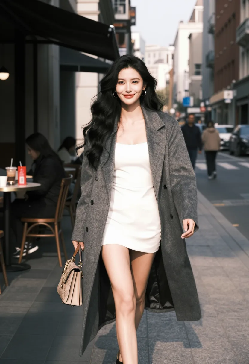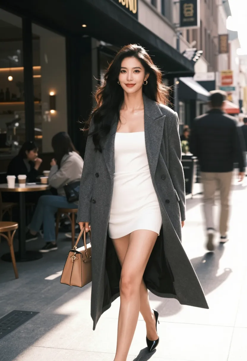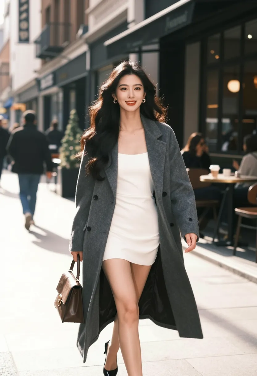 8K, ultra-detailed, masterpiece, best quality, street photography, Western urban art style, Asian female walking on Western city street, wearing stylish gray coat over white dress, long black hair in elegant style, graceful and seductive pose, walking forward with one hand holding designer bag, other hand naturally swinging, natural expression with bright smile, modern Western city street setting with contemporary buildings and urban elements, bright natural sunlight, front view three-quarter shot, sharp focus on body and face, soft focus on street background, dramatic lighting from sun creating rim light, vibrant atmosphere, modern color palette (gray, white, beige, gold), 85mm f1.4, cinematic depth of field