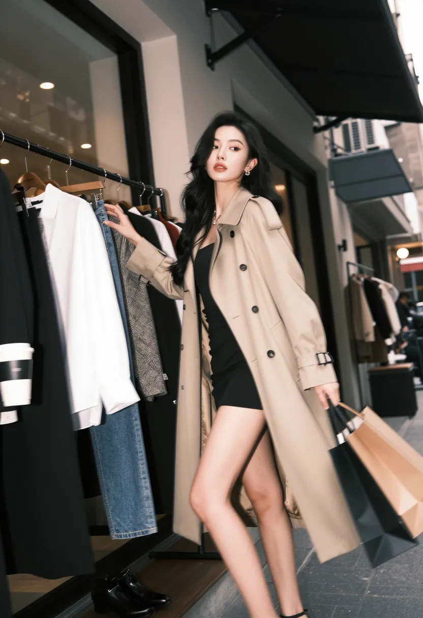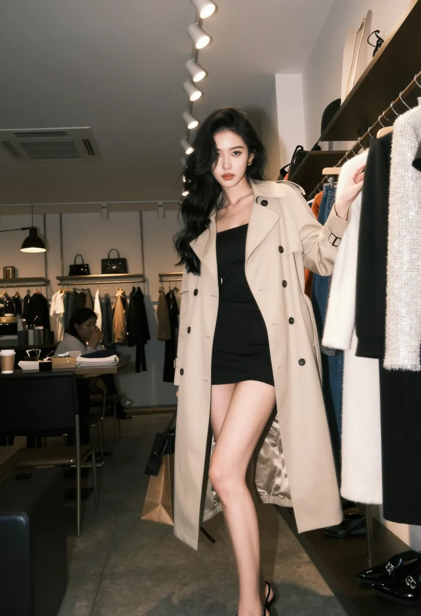 8K, ultra-detailed, masterpiece, best quality, fashion photography, Western boutique art style, Asian female in Western fashion boutique, wearing elegant beige trench coat over black dress, long black hair in sophisticated updo, graceful and seductive pose, standing by clothing rack with one hand touching garment, other hand holding shopping bag, natural expression with interested gaze, trendy Western boutique setting with modern displays and elegant decor, soft boutique lighting, low angle shot from side, sharp focus on body and face, soft focus on boutique background, dramatic lighting from boutique lights creating soft highlights, fashionable atmosphere, sophisticated color palette (beige, black, white, gold), 35mm f1.8, cinematic composition
