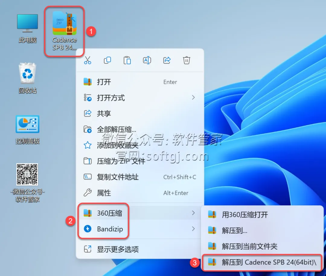 1.解压安装包:①鼠标右击【Cadence SPB 24(64bit)】压缩包②选择电脑上安装的解压软件(如:360压缩)③点击【解压到Cadence SPB 24(64bit)】。