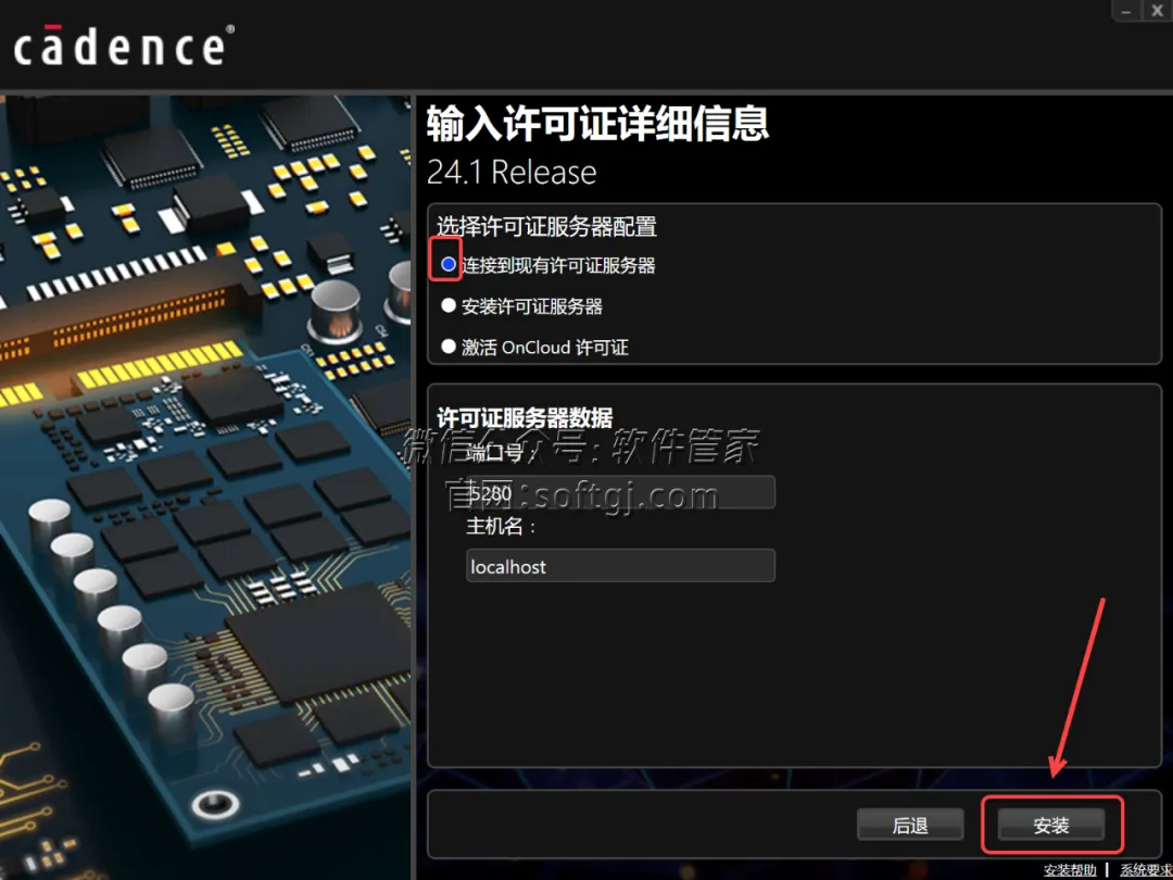 7.选择【连接到现有许可证...】,点击【安装】。