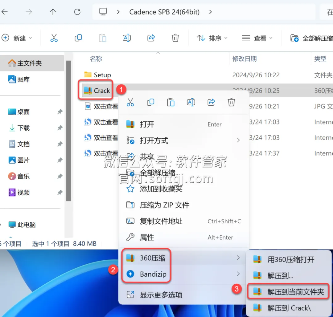 10.打开安装包解压后的【Cadence SPB 24(64bit)】文件夹,①鼠标右击【Crack】压缩包②选择电脑上安装的解压软件(如:360压缩)③点击【解压到当前文件夹】。