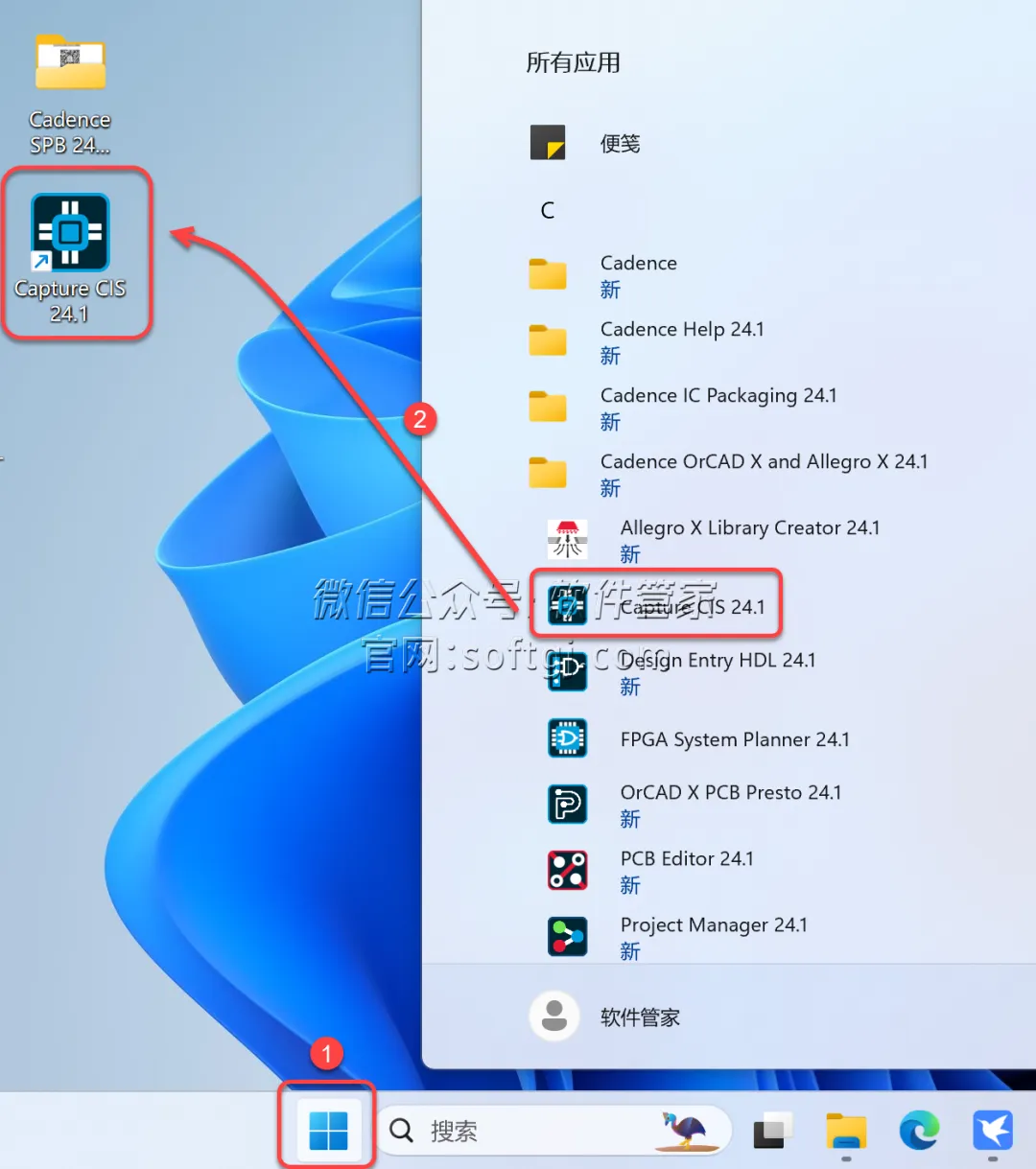14.创建桌面快捷方式:①点击桌面任务栏中的【开始图标】>点击【所有应用】>双击展开【Cadence OrCAD X and...】文件夹②将【Capture CIS 24.1】图标拖到电脑桌面。