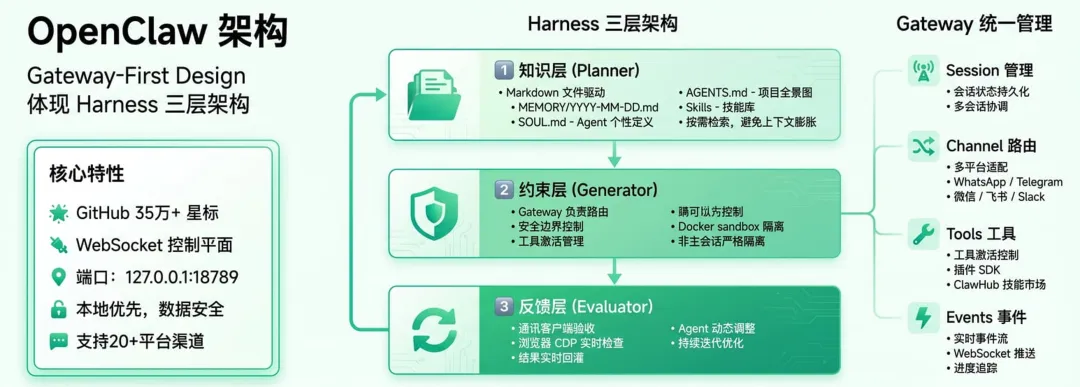 约束层(Generator) 由 Gateway 负责路由、安全边界和工具激活,非主会话直接扔进 Docker sandbox 隔离。