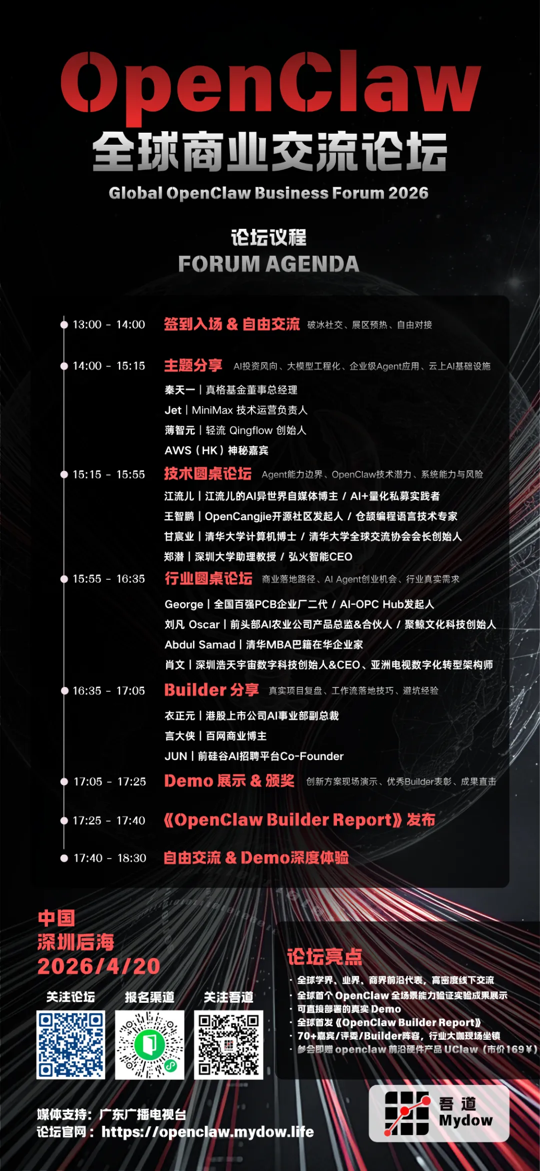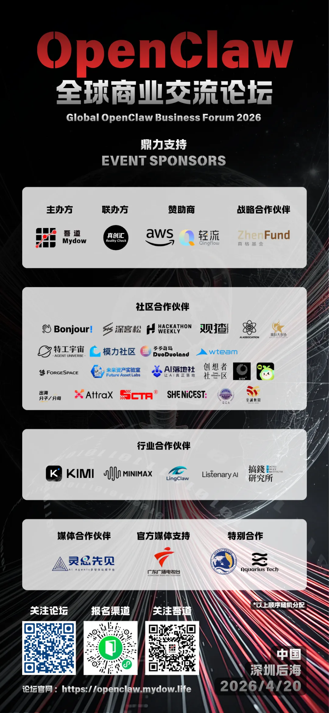 4 月 20 日,OpenClaw 全球商业交流论坛将正式举办!
