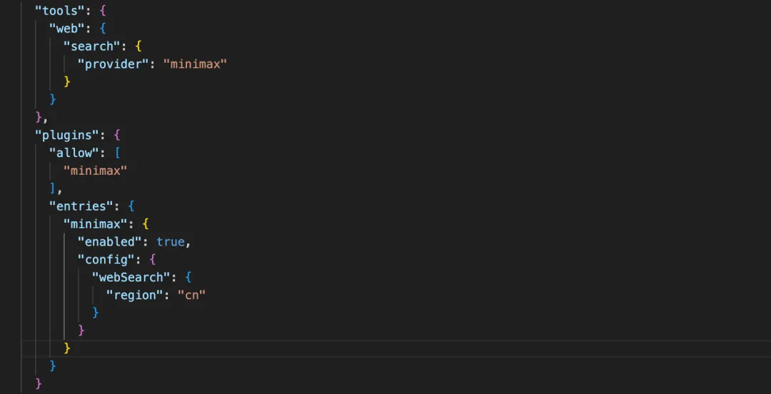 一边看OpenClaw文档,一边看minimax的其他客户端配置的参考文档,自己摸索,综合两个文档的信息,继续挖OpenClaw源码,终于发现了一个关键事实:OpenClaw其实有内置的plugins.entries.minimax配置,根本不需要走额外的MCP那套。配置大概是这个样子: