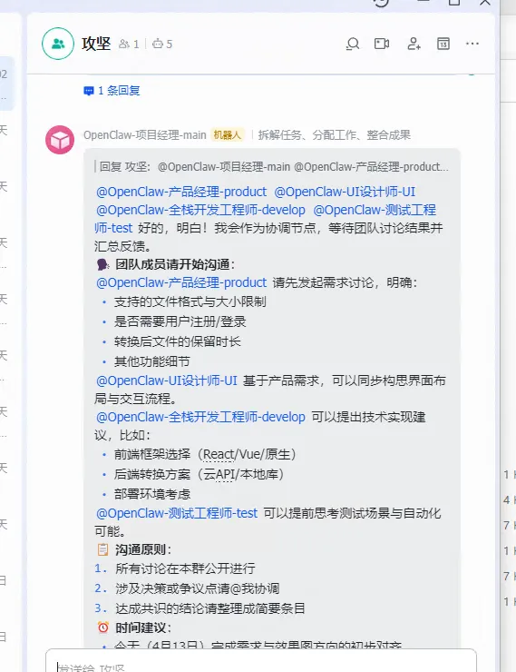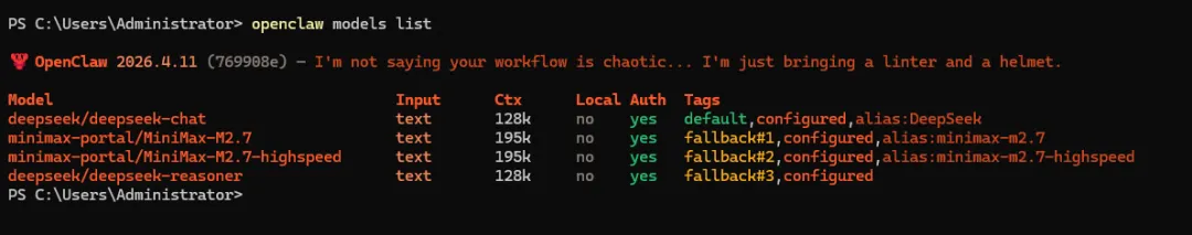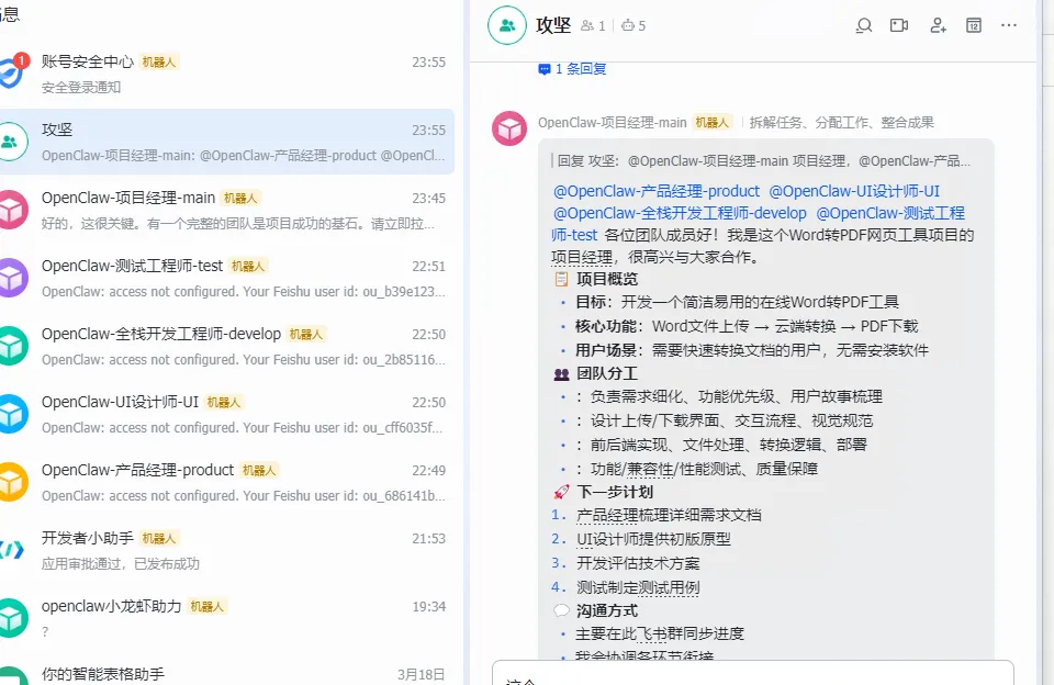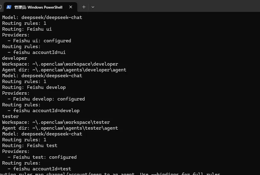 PS C:\Users\Administrator> openclaw agents list🦞 OpenClaw 2026.4.11 (769908e) — Your personal assistant, minus the passive-aggressive calendar reminders.23:17:14+08:00 [plugins] feishu_doc: Registered feishu_doc, feishu_app_scopes23:17:14+08:00 [plugins] feishu_chat: Registered feishu_chat tool23:17:14+08:00 [plugins] feishu_wiki: Registered feishu_wiki tool23:17:14+08:00 [plugins] feishu_drive: Registered feishu_drive tool23:17:14+08:00 [plugins] feishu_bitable: Registered bitable toolsAgents:- main_list (default) (项目经理)Workspace: ~\.openclaw\workspaceAgent dir: ~\.openclaw\agents\main_list\agentModel: deepseek/deepseek-reasonerRouting rules: 1Routing: Feishu mainProviders:- Feishu main: configured- product_manager (产品经理)Workspace: ~\.openclaw\workspace\product_managerAgent dir: ~\.openclaw\agents\product_manager\agentModel: minimax/minimax-m2.7Routing rules: 1Routing: Feishu productProviders:- Feishu product: configured- ui_designer (UI设计师)Workspace: ~\.openclaw\workspace\ui_designerAgent dir: ~\.openclaw\agents\ui_designer\agentModel: minimax/minimax-m2.7Routing rules: 1Routing: Feishu uiProviders:- Feishu ui: configured- developer (全栈开发工程师)Workspace: ~\.openclaw\workspace\developerAgent dir: ~\.openclaw\agents\developer\agentModel: minimax/minimax-m2.7Routing rules: 1Routing: Feishu developProviders:- Feishu develop: configured- tester (测试工程师)Workspace: ~\.openclaw\workspace\testerAgent dir: ~\.openclaw\agents\tester\agentModel: minimax/minimax-m2.7-highspeedRouting rules: 1Routing: Feishu testProviders:- Feishu test: configuredRouting rules map channel/account/peer to an agent. Use --bindings for full rules.Channel status reflects local config/creds. For live health: openclaw channels status --probe.PS C:\Users\Administrator>