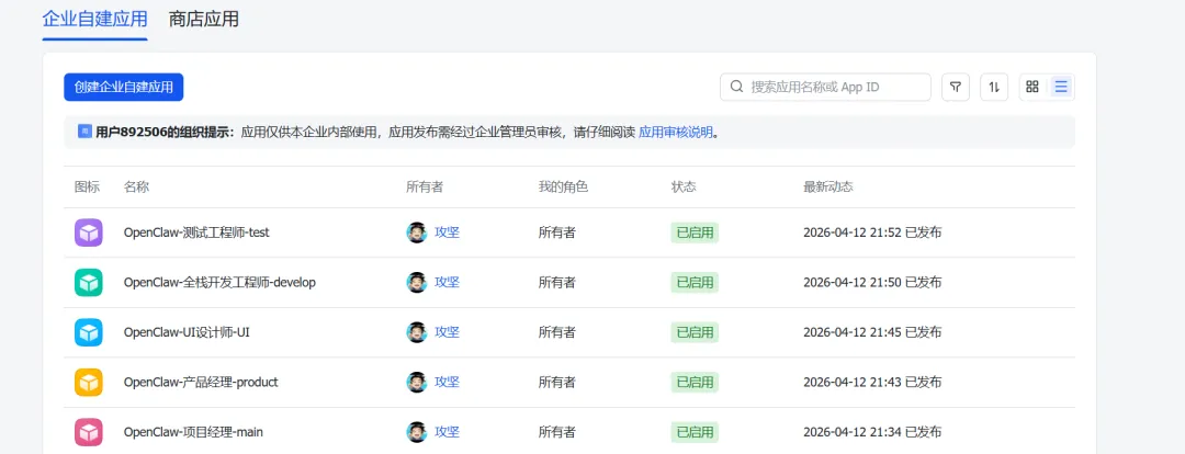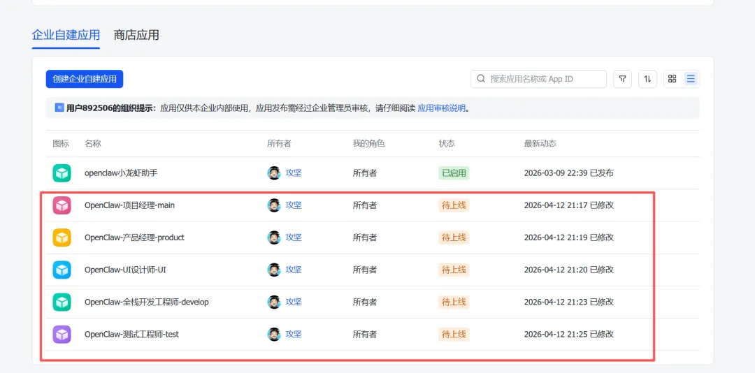 3.1、登录飞书开放平台,创建5个应用: